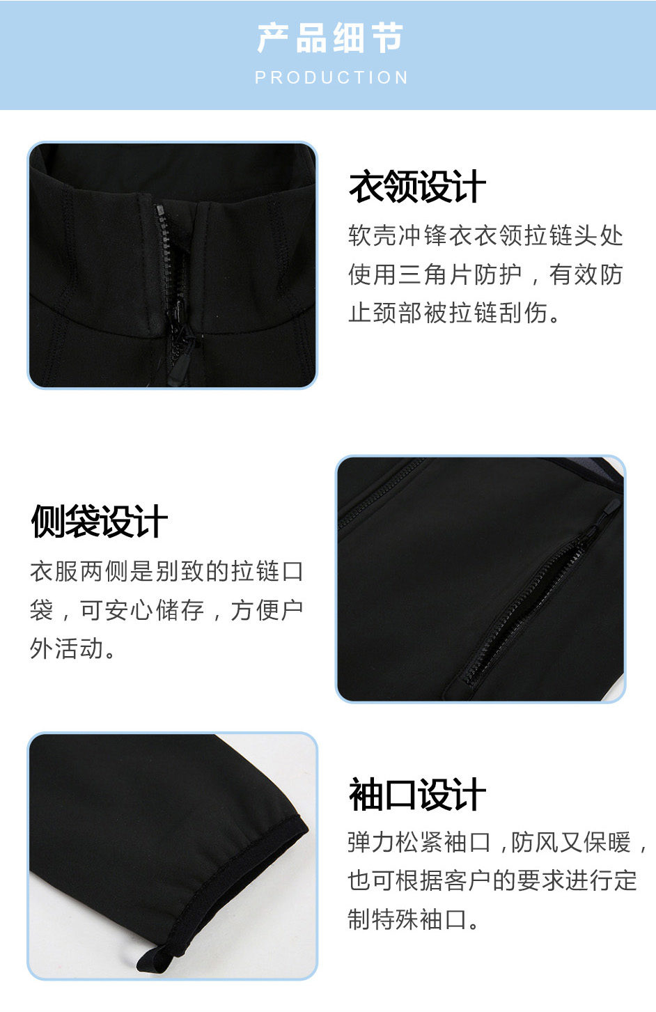 衣領設計:軟殼沖鋒衣衣領拉鏈頭處使用三角片防護,有效防止頸部被拉鏈刮傷。