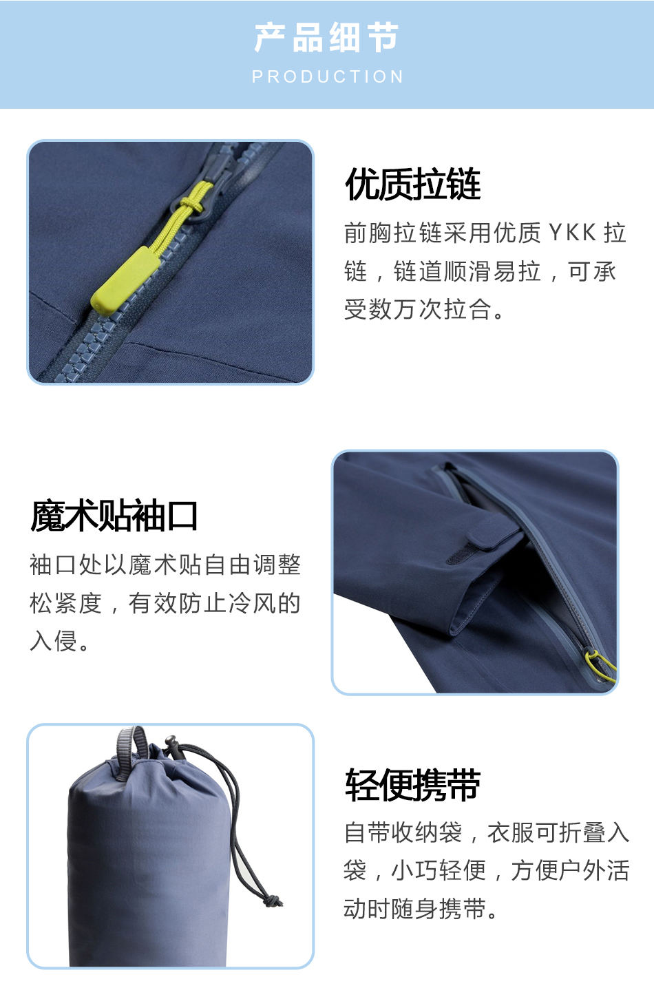 • 魔術貼袖口軟殼沖鋒衣生產出的袖口處以魔術貼自由調整松緊度,有效防止冷風的入侵。