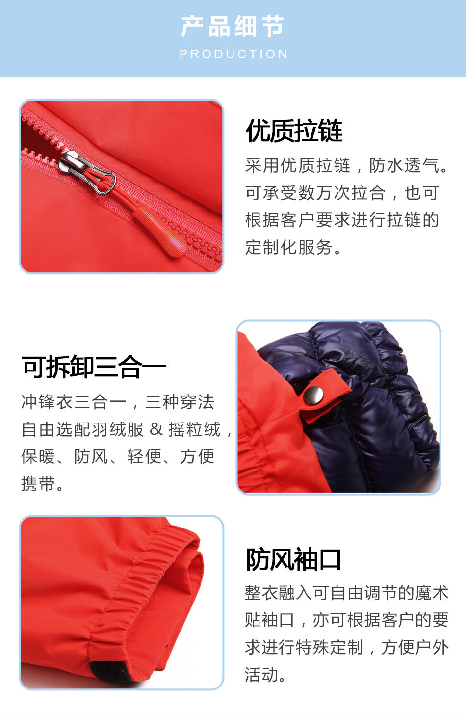 可拆卸三合一:校服沖鋒衣三合一,三種穿法自由選配羽絨服&搖粒絨,保暖、防風(fēng)、輕便、方便攜帶。