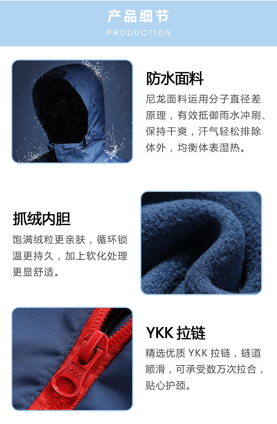 防水面料:尼龍面料運用分子直徑差原理,有效抵御雨水沖刷、保持干爽,汗氣輕松排除體外,均衡體表濕熱可根據沖鋒衣定制不同來選擇面料。