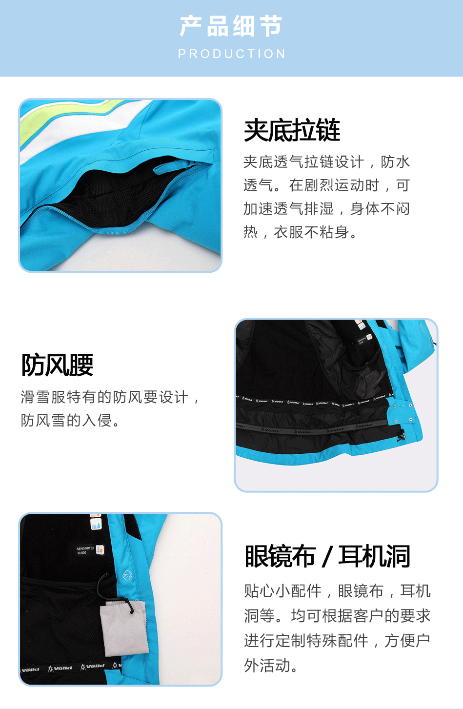 防水拉鏈采用無(wú)縫壓膠防水拉鏈激光熱封工藝貼合,面料采用進(jìn)口防水透氣涂層膜,使防水透氣膜與面料完美結(jié)合。可根據(jù)客戶需求生產(chǎn)加工沖鋒衣。