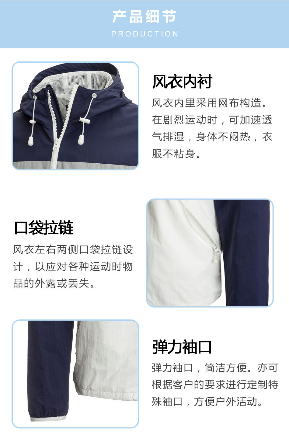 彈力袖口:彈力袖口,簡潔方便。亦可根據(jù)客戶的要求進行定制特殊袖口,方便戶外活動。