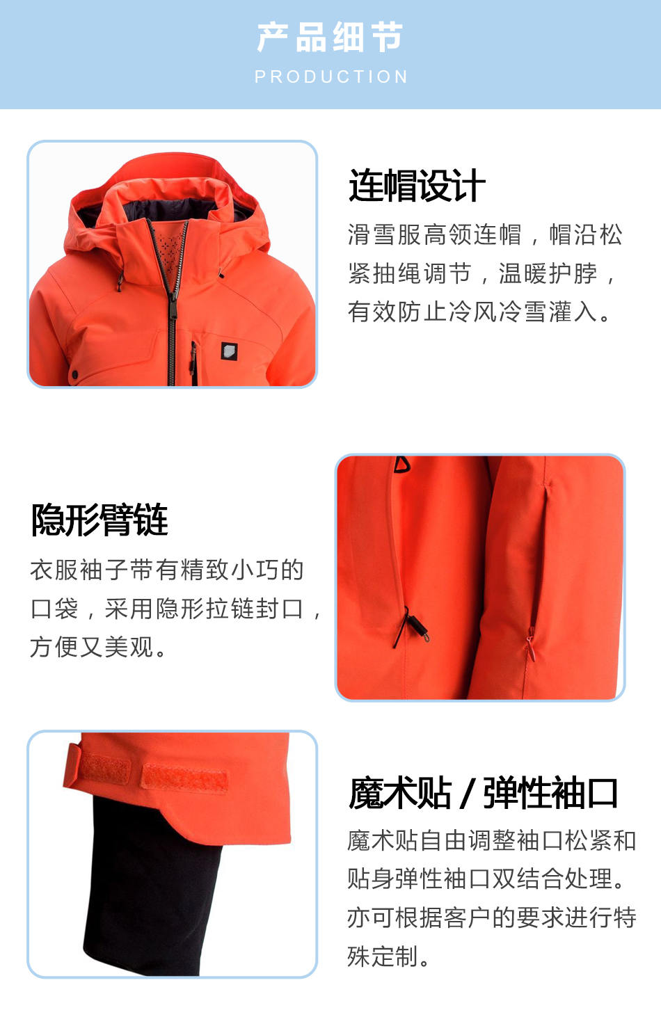 連帽設計:滑雪服高領連帽,帽沿松緊抽繩調節,溫暖護脖,有效防止冷風冷雪灌入。
