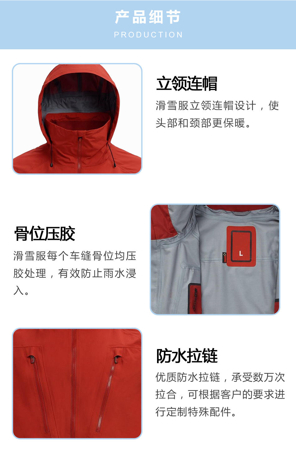 骨位壓膠:壓膠滑雪服生產(chǎn)的每個(gè)車縫骨位均壓膠處理,有效防止雨水浸入。